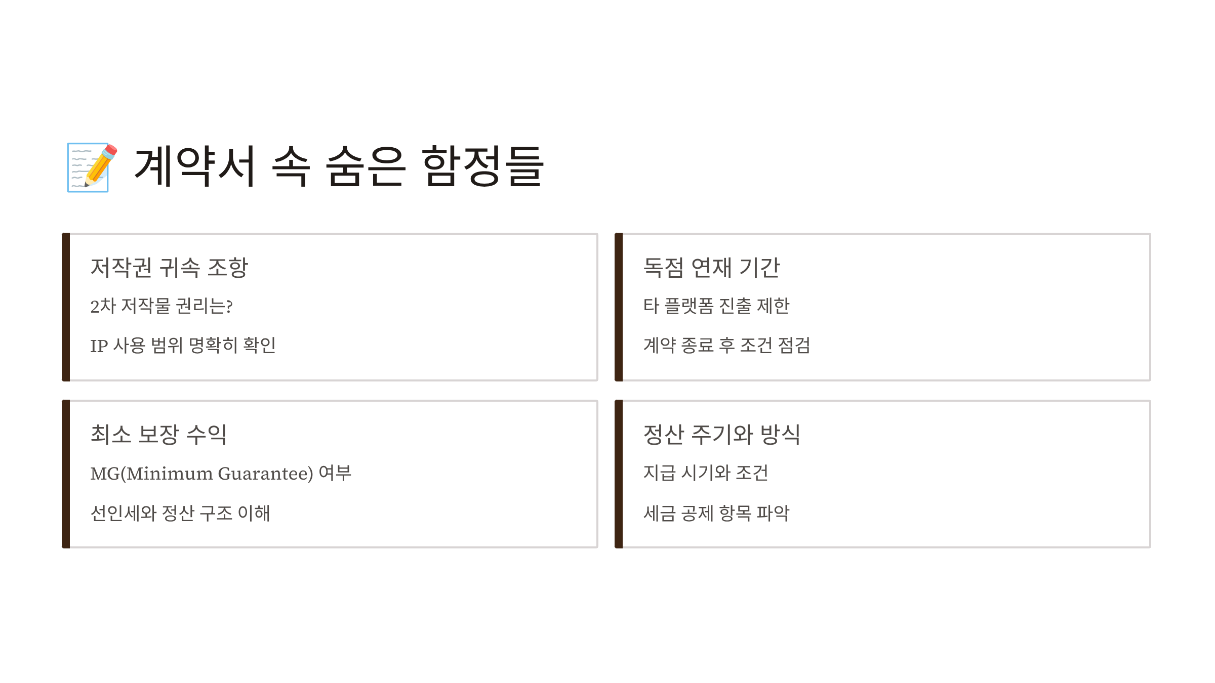 ⚠️ 주의 사항: 계약서 꼼꼼히 확인, 저작권 및 독점 조항 체크